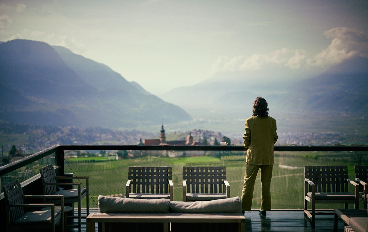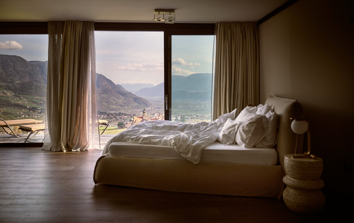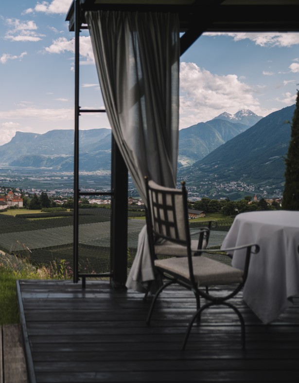 Dalla camera, dalla piscina, dal giardino e dalla terrazza si gode una vista che non conosce ostacoli e che spazia sui boschi, sulle montagne e sulla splendida città termale di Merano.